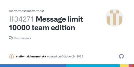 King@sh.itjust.worksEnglish · 1 day agoMattermost restricted access to old messages after 10000 limit is reachedplus-squaregithub.comexternal-linkmessage-square12fedilinkarrow-up175arrow-down14